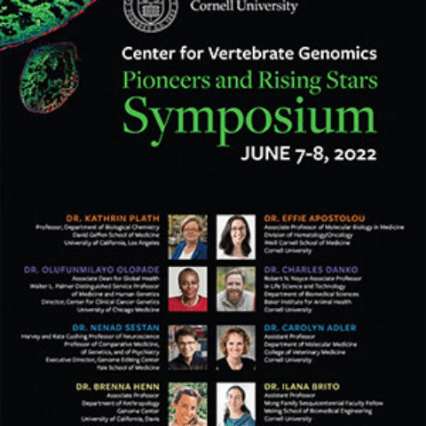 The Center for Vertebrate Genomics (CVG) was created to enhance research and education in vertebrate genetics and functional genomics at Cornell University. As part of that overall goal, the CVG aims to foster research interactions amongst vertebrate geneticists and other faculty. The biennial symposium provides an opportunity to learn more about the exciting research in vertebrate genomics that is being conducted both within and outside of Cornell, through presentations from distinguished invited speakers and through opportunities for graduate students and postdoctoral fellows of CVG labs to showcase their own research.